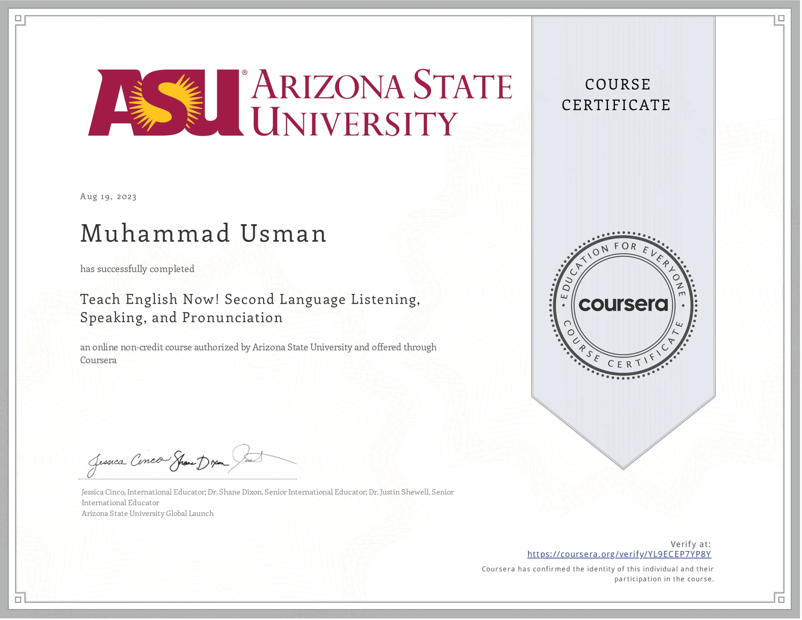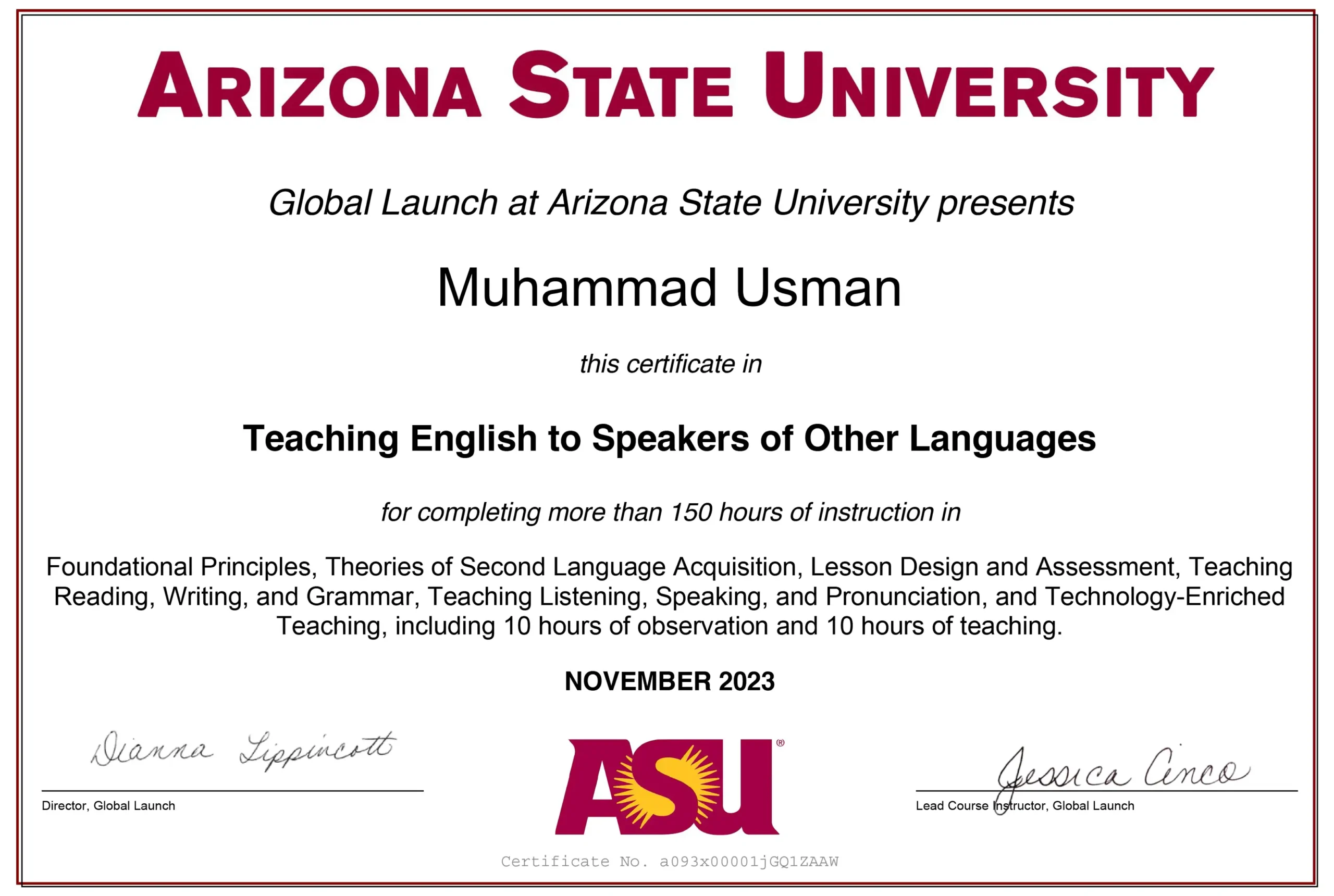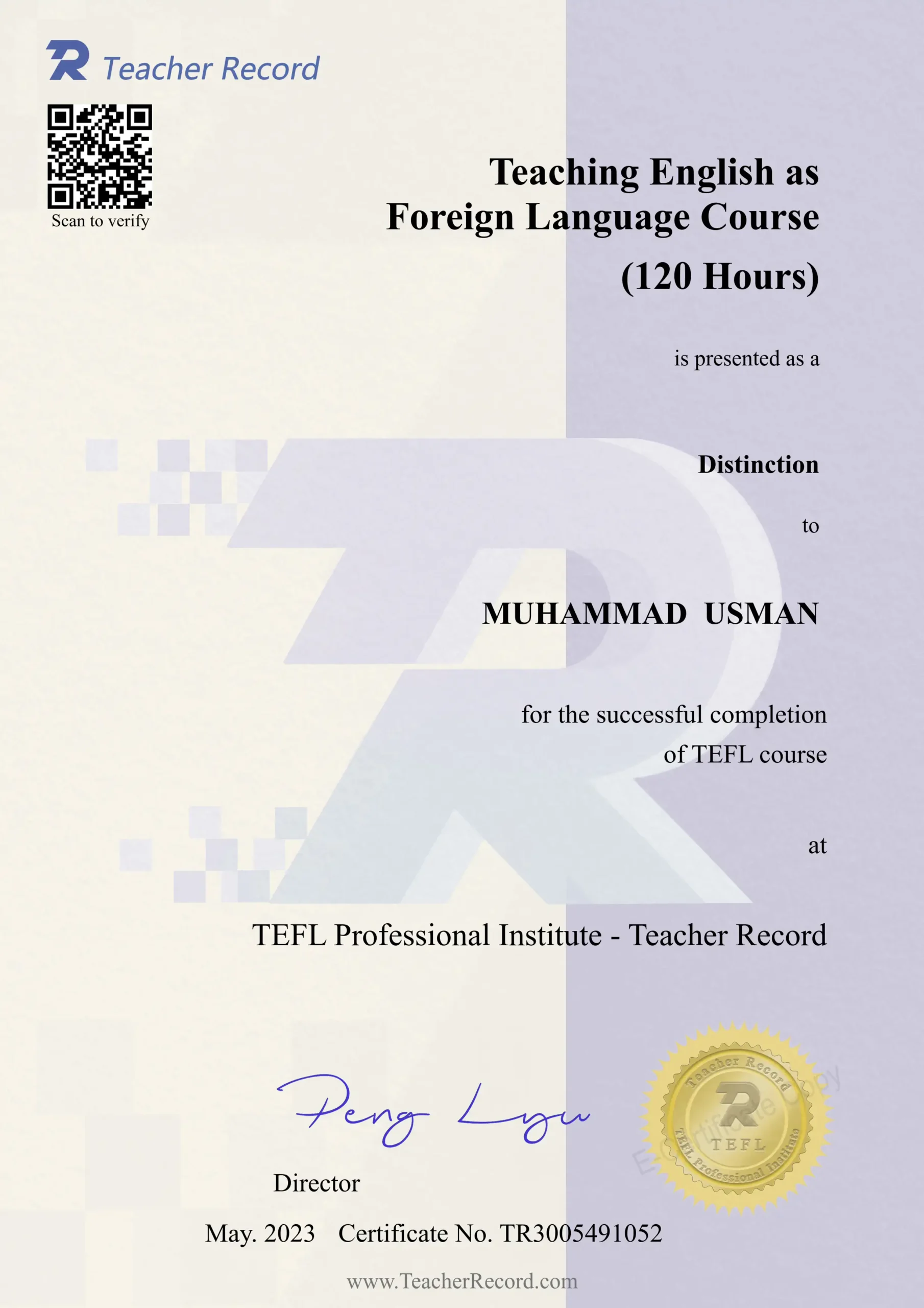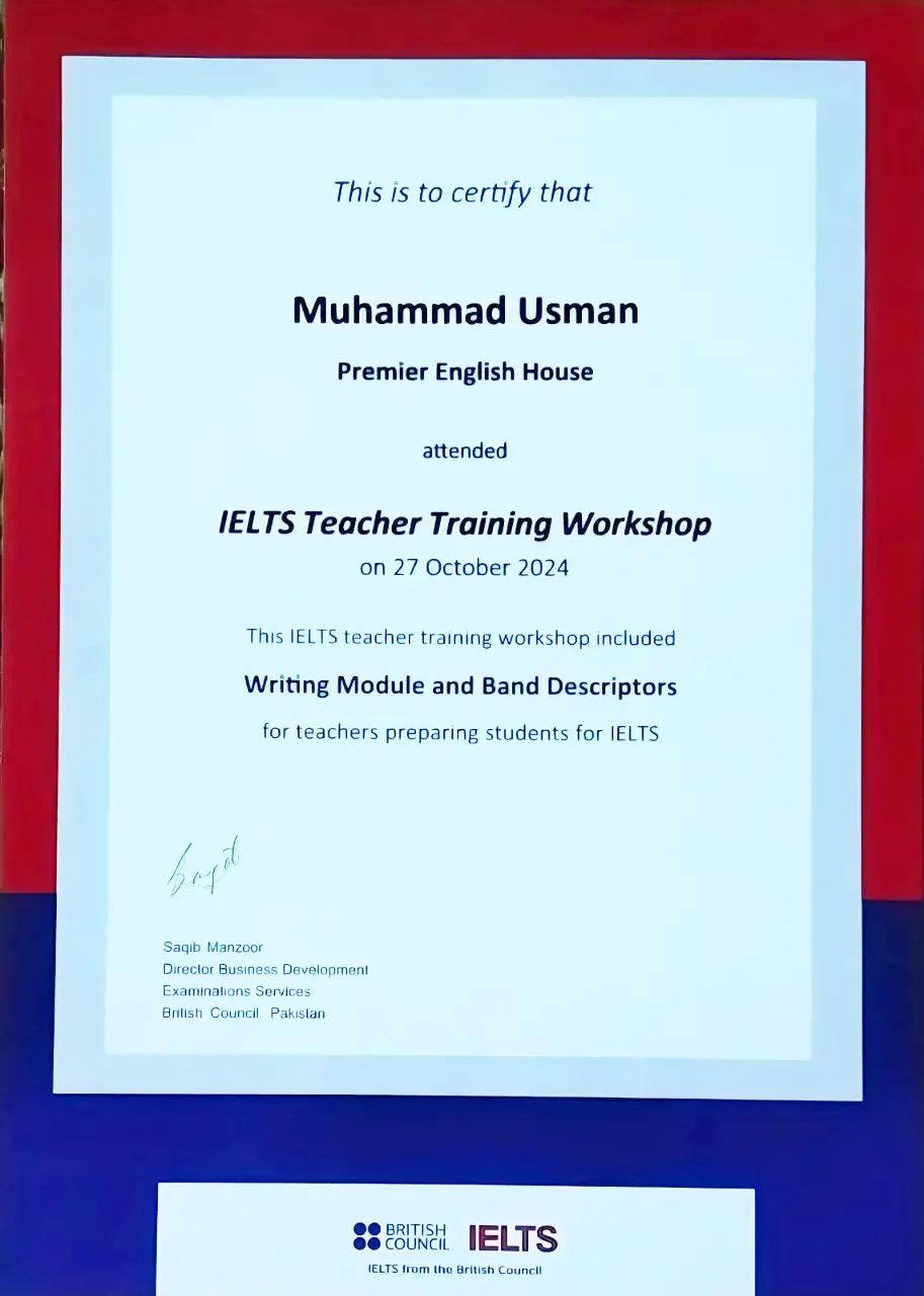 Muhammad Usman has completed multiple internationally recognized certifications in teaching English as a second or foreign language. These qualifications reflect his expertise in ESL instruction, exam preparation, and innovative teaching methodologies. Each certification has contributed to his ability to provide high-quality, results-oriented English training at Premier English House.